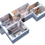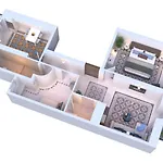 Denna lägenhet på 100 m^2 har balkong, klädloge och soffa i varje rum. Lägenheten består av 1 sovrum och 1 badrum med bidé, separat toalett och dusch.